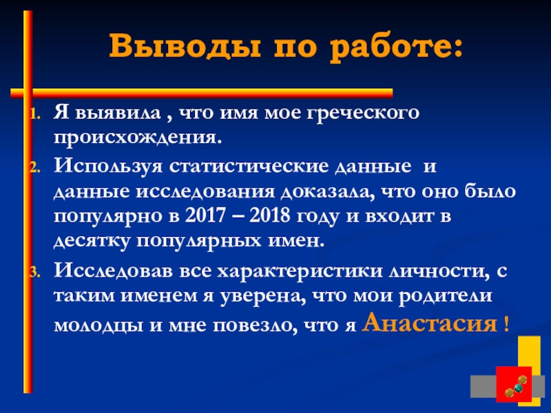 Выводы по работе:Я выявила , что имя мое греческого происхождения.Используя статистические данные и данные исследования доказала, что