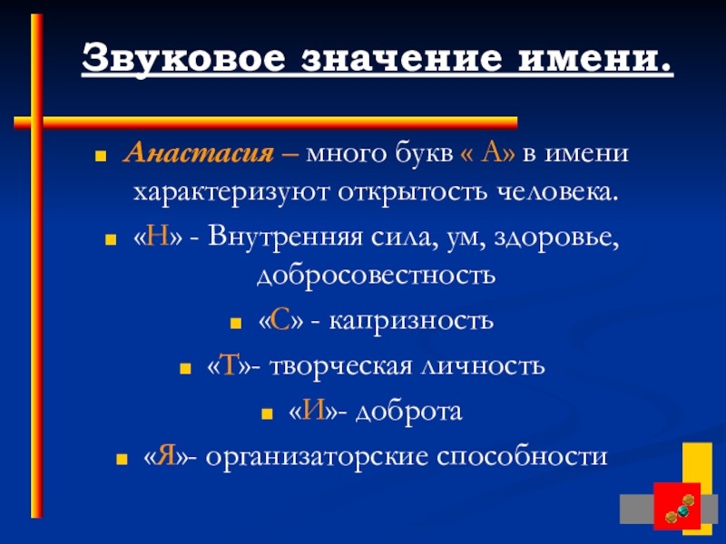 Звуковое значение имени. Анастасия – много букв « А» в имени характеризуют открытость человека. «Н» -