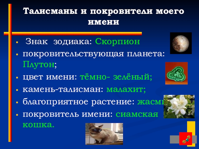 Талисманы и покровители моего имени Знак зодиака: Скорпион покровительствующая планета: Плутон;цвет имени: тёмно- зелёный;камень-талисман: малахит;благоприятное растение: жасмин;покровитель