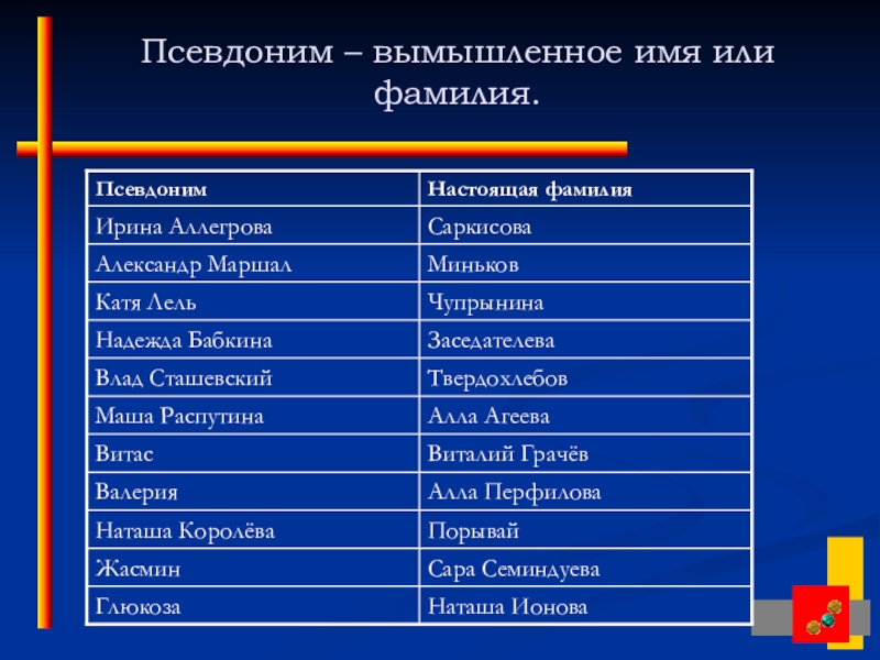 Слайд 11Псевдоним – вымышленное имя или фамилия.