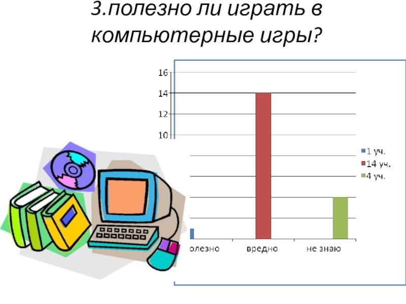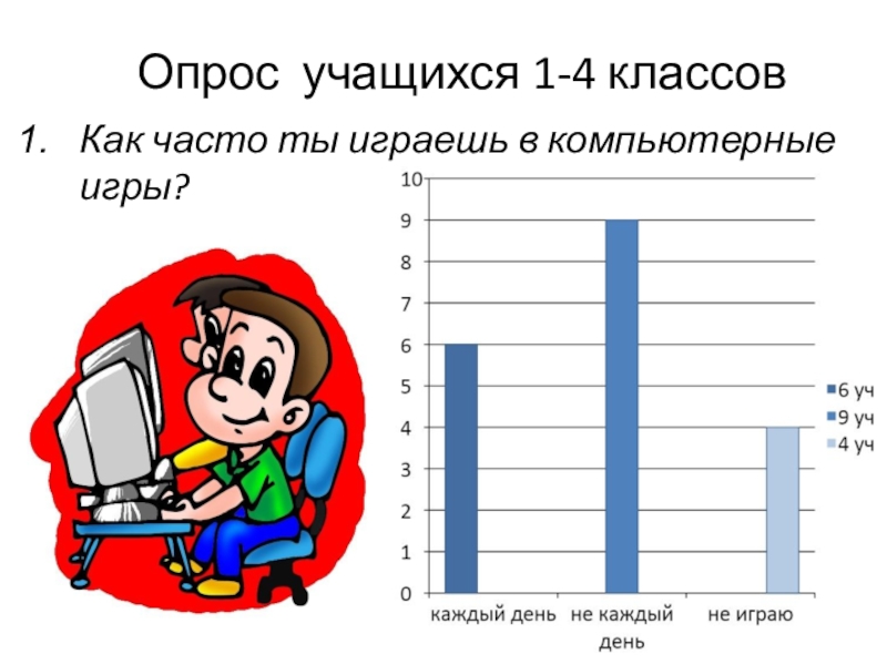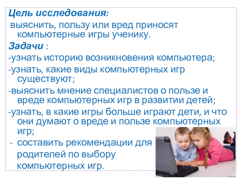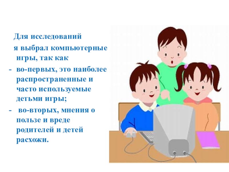 за любимой компьютерной игрой, то слышал от мамы: «Не сиди долго у компьютера, это вредно!». Мне стало интересно, правда ли компьютер плохо влияет на здоровье, и все ли игры полезны.
