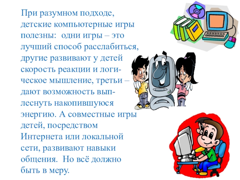 – это лучший способ расслабиться, другие развивают у детей скорость реакции и логи-ческое мышление, третьи – дают возможность вып-леснуть накопившуюся энергию. А совместные игры детей, посредством Интернета или локальной сети, развивают навыки общения. Но всё должно быть в меру.