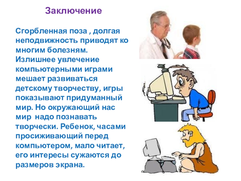 компьютерными играми мешает развиваться детскому творчеству, игры показывают придуманный мир. Но окружающий нас мир надо познавать творчески. Ребенок, часами просиживающий перед компьютером, мало читает, его интересы сужаются до размеров экрана.