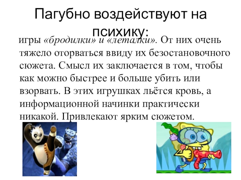 очень тяжело оторваться ввиду их безостановочного сюжета. Смысл их заключается в том, чтобы как можно быстрее и больше убить или взорвать. В этих игрушках льётся кровь, а информационной начинки практически никакой. Привлекают ярким сюжетом.
