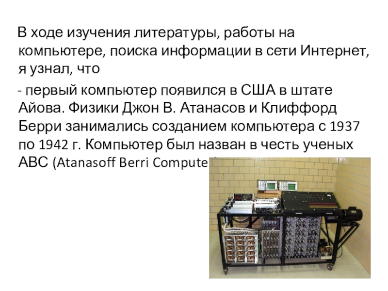 - первый компьютер появился в США в штате Айова. Физики Джон В. Атанасов и Клиффорд Берри занимались созданием компьютера с 1937 по 1942 г. Компьютер был назван в честь ученых АВС (Atanasoff Berri Computer).