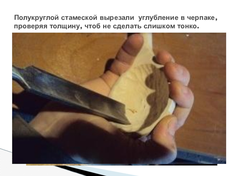 Слайд 19Полукруглой стамеской вырезали углубление в черпаке, проверяя толщину, чтоб не сделать