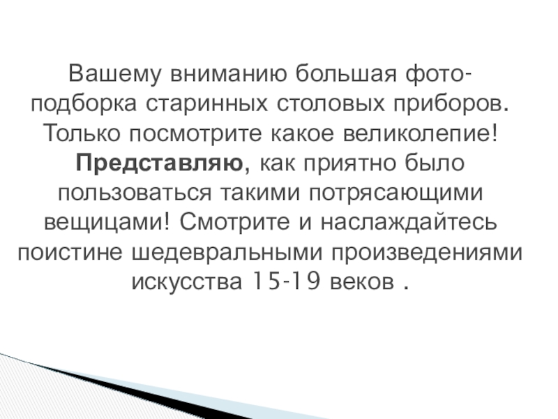 Слайд 30Вашему вниманию большая фото-подборка старинных столовых приборов. Только посмотрите какое великолепие!