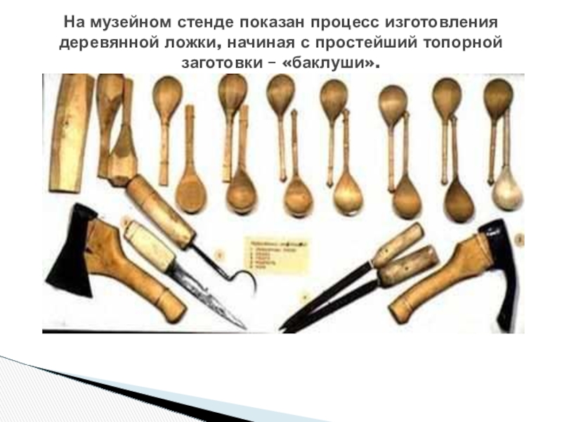 Слайд 16На музейном стенде показан процесс изготовления деревянной ложки, начиная с простейший
