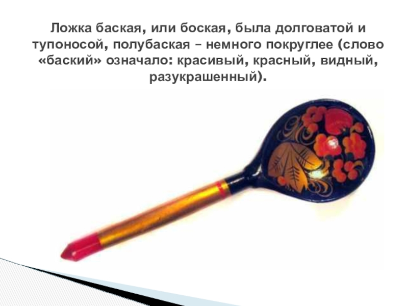 Слайд 12Ложка баская, или боская, была долговатой и тупоносой, полубаская – немного
