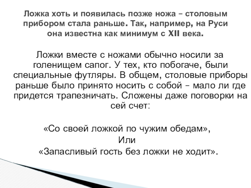 Слайд 29 Ложки вместе с ножами обычно носили за голенищем сапог. У