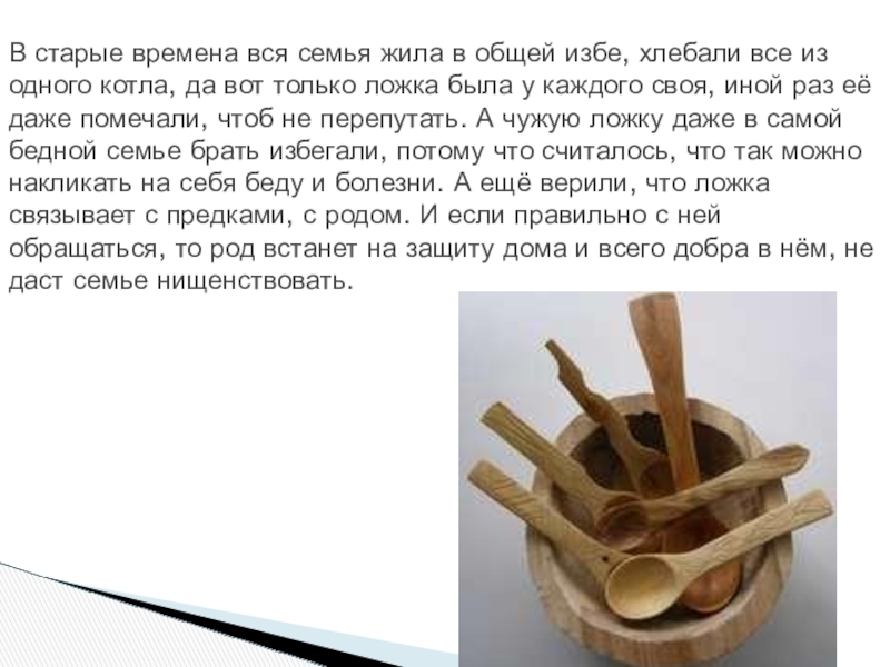 из одного котла, да вот только ложка была у каждого своя, иной раз её даже помечали, чтоб не перепутать. А чужую ложку даже в самой бедной семье брать избегали, потому что считалось, что так можно накликать на себя беду и болезни. А ещё верили, что ложка связывает с предками, с родом. И если правильно с ней обращаться, то род встанет на защиту дома и всего добра в нём, не даст семье нищенствовать.