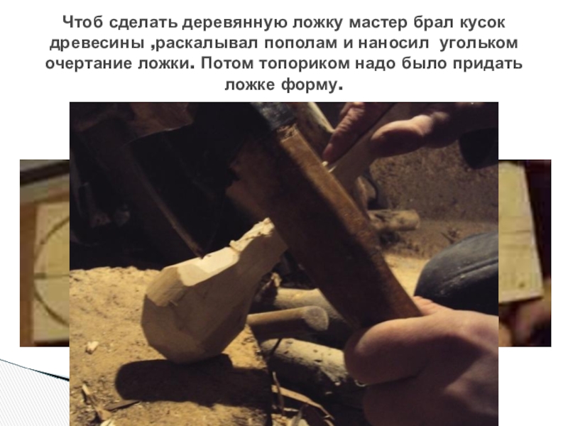 Слайд 17Чтоб сделать деревянную ложку мастер брал кусок древесины ,раскалывал пополам и
