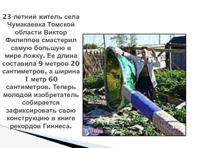 Слайд 3623-летний житель села Чумакаевка Томской области Виктор Филиппов смастерил самую большую