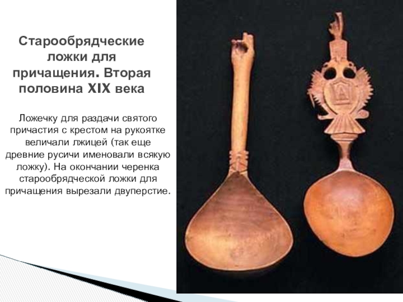 причастия с крестом на рукоятке величали лжицей (так еще древние русичи именовали всякую ложку). На окончании черенка старообрядческой ложки для причащения вырезали двуперстие.