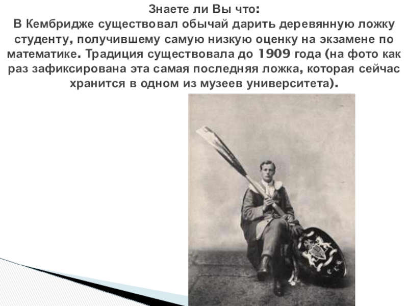 получившему самую низкую оценку на экзамене по математике. Традиция существовала до 1909 года (на фото как раз зафиксирована эта самая последняя ложка, которая сейчас хранится в одном из музеев университета).