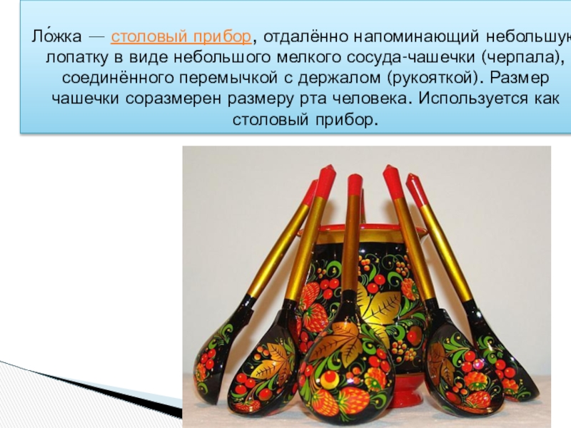 Ло́жка — столовый прибор, отдалённо напоминающий небольшую лопатку в виде небольшого мелкого