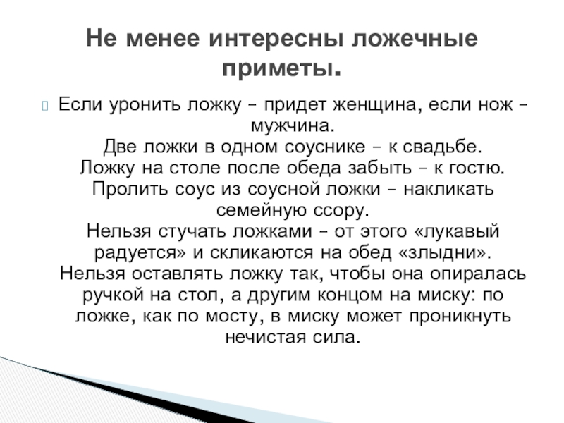 Слайд 43Если уронить ложку – придет женщина, если нож – мужчина.