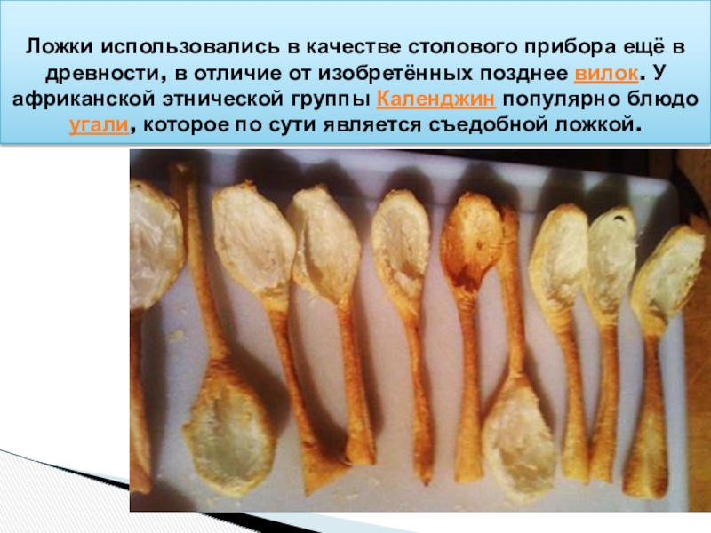 от изобретённых позднее вилок. У африканской этнической группы Календжин популярно блюдо угали, которое по сути является съедобной ложкой.