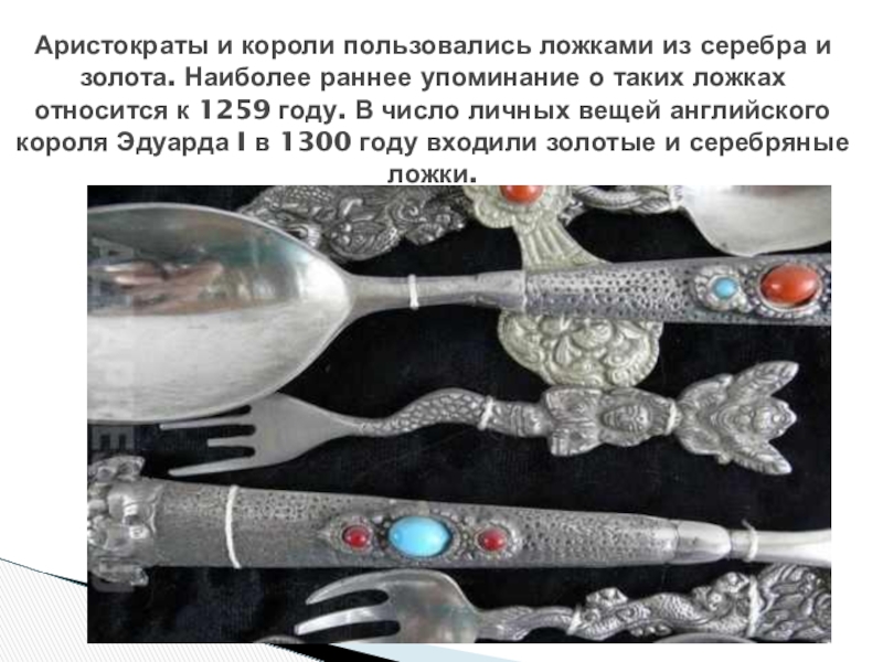 Слайд 26Аристократы и короли пользовались ложками из серебра и золота. Наиболее раннее