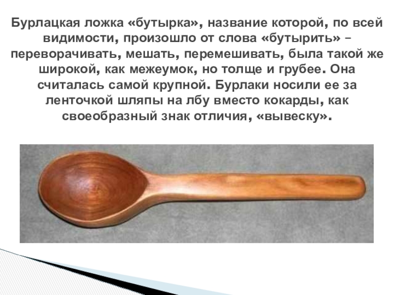 Слайд 11Бурлацкая ложка «бутырка», название которой, по всей видимости, произошло от слова