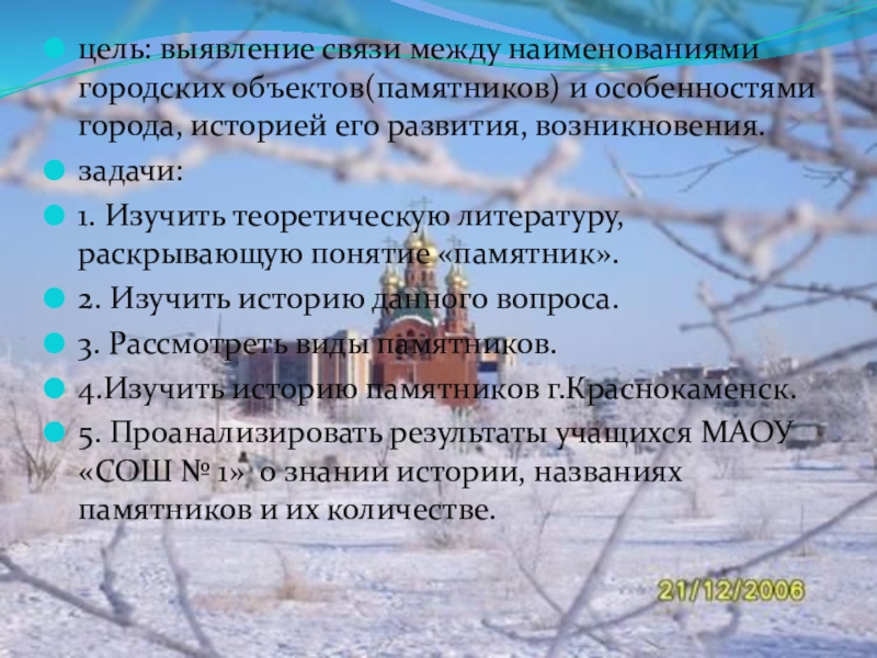 цель: выявление связи между наименованиями городских объектов(памятников) и особенностями города, историей его развития, возникновения.задачи:1. Изучить теоретическую литературу, раскрывающую понятие «памятник».2. Изучить историю данного вопроса.3. Рассмотреть виды памятников.4.Изучить историю памятников г.Краснокаменск.5. Проанализировать результаты учащихся МАОУ «СОШ №