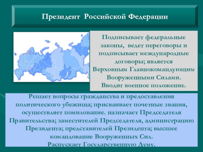 Решает вопросы гражданства и предоставления политического убежища; присваивает почетные звания, осуществляет помилование. назначает Председателя Правительства; заместителей Председателя, администрацию Президента; представителей Президента; высшее командование Вооруженных Сил.