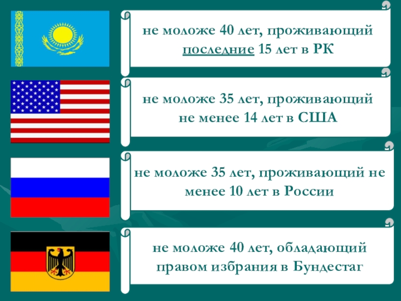 не моложе 40 лет, проживающий последние 15 лет в РК