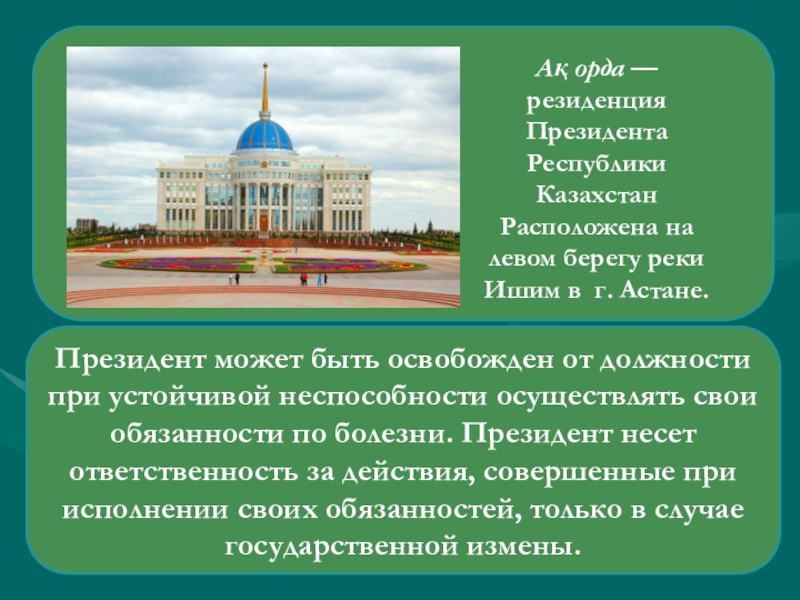 Ақ орда — резиденция Президента Республики Казахстан Расположена на левом берегу реки Ишим в г. Астане.