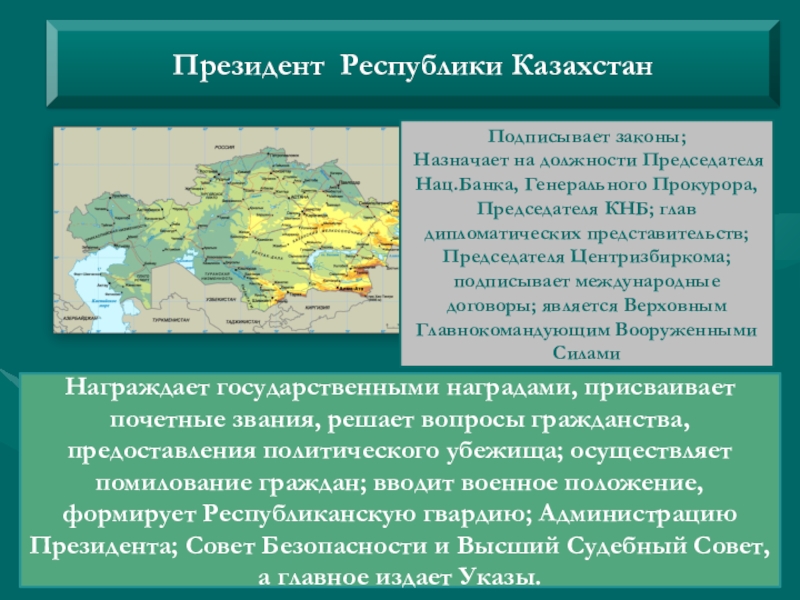 Награждает государственными наградами, присваивает почетные звания, решает вопросы гражданства, предоставления политического убежища; осуществляет помилование граждан; вводит военное положение, формирует Республиканскую гвардию; Администрацию Президента; Совет Безопасности и Высший Судебный Совет, а главное издает Указы.