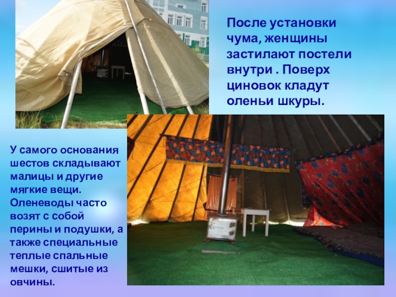 У самого основания шестов складывают малицы и другие мягкие вещи. Оленеводы часто возят с собой перины и подушки, а также специальные теплые спальные мешки, сшитые из овчины.
