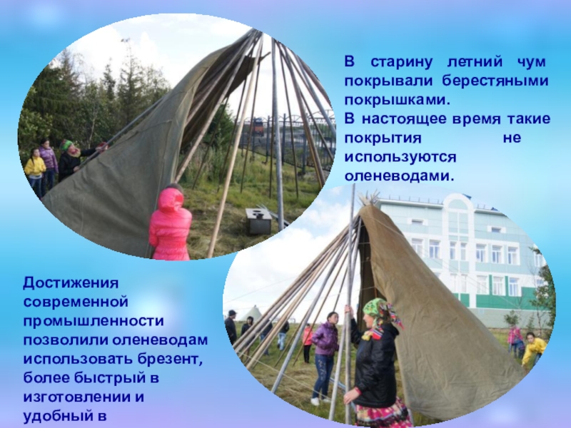 Достижения современной промышленности позволили оленеводам использовать брезент, более быстрый в изготовлении и удобный в транспортировке.