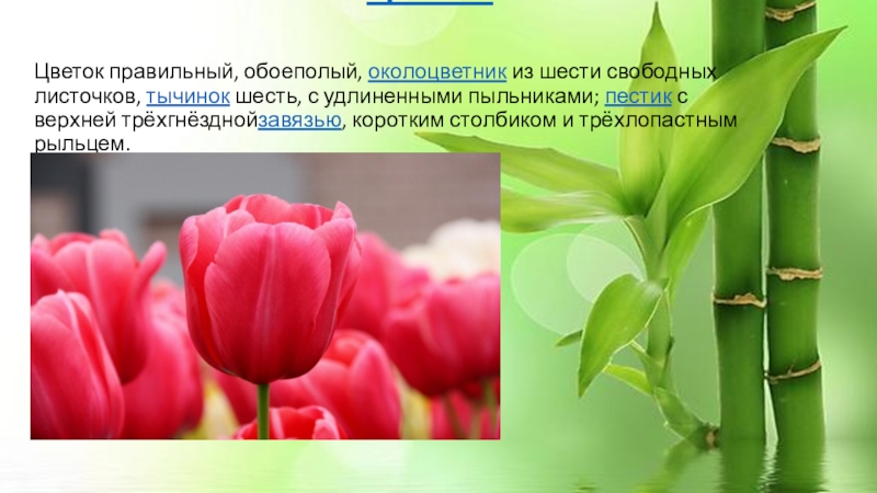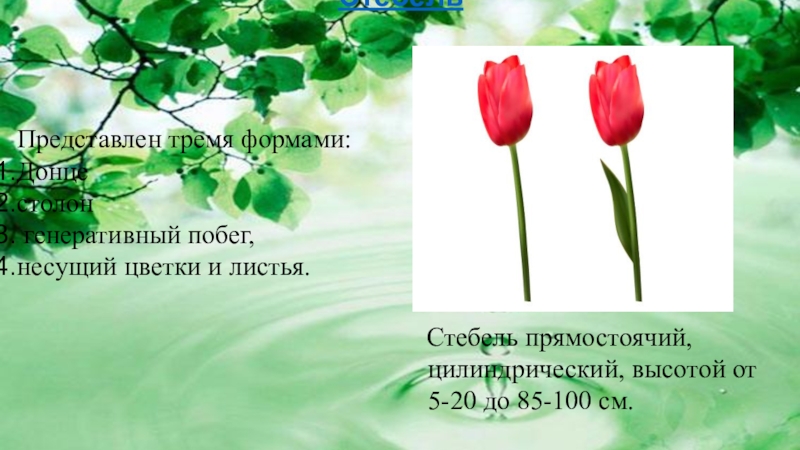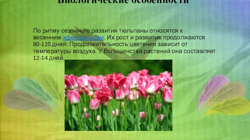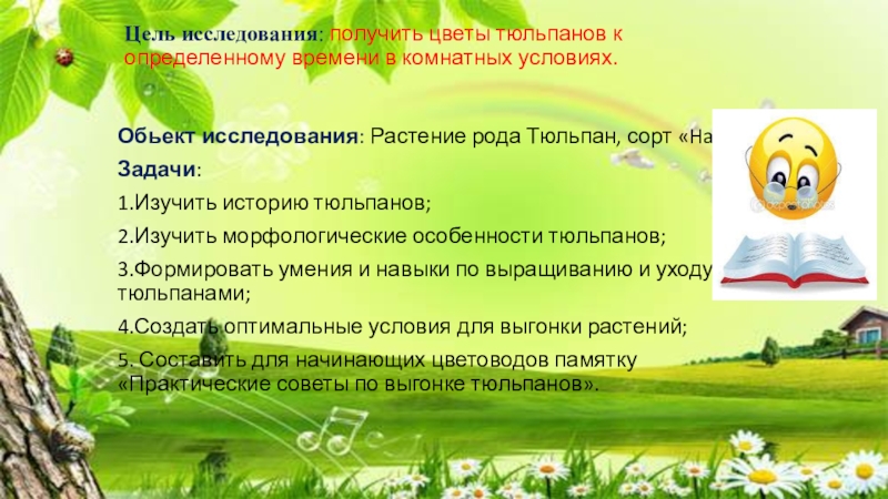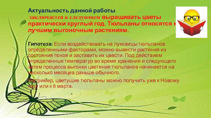 Гипотеза: Если воздействовать на луковицы тюльпанов определенными факторами, можно вывести растения из состояния покоя и заставить их цвести. Под действием определенных температур во время хранения и следующего затем процесса выгонки цветения тюльпанов начинается на несколько месяцев раньше обычного.