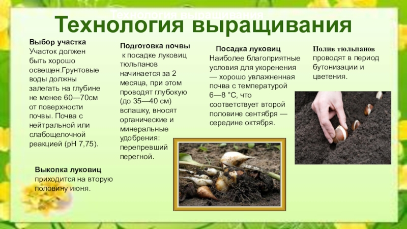 к посадке луковиц тюльпанов начинается за 2 месяца, при этом проводят глубокую (до 35—40 см) вспашку, вносят органические и минеральные удобрения: перепревший перегной.