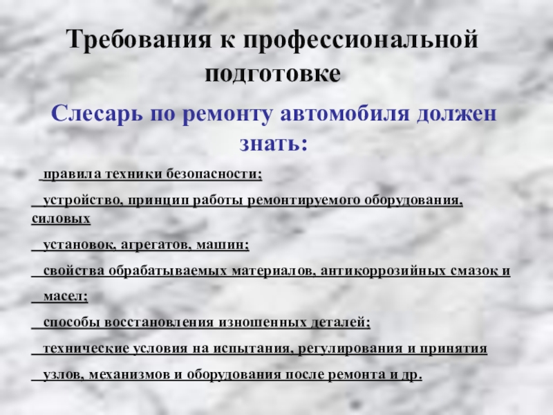В работе слесаря по ремонту автомобиля требуется знание техники безопасности, устройства и принципа работы автомобиля, особенностей оборудования, которое используется в работе, свойств обрабатываемых материалов и масел.
