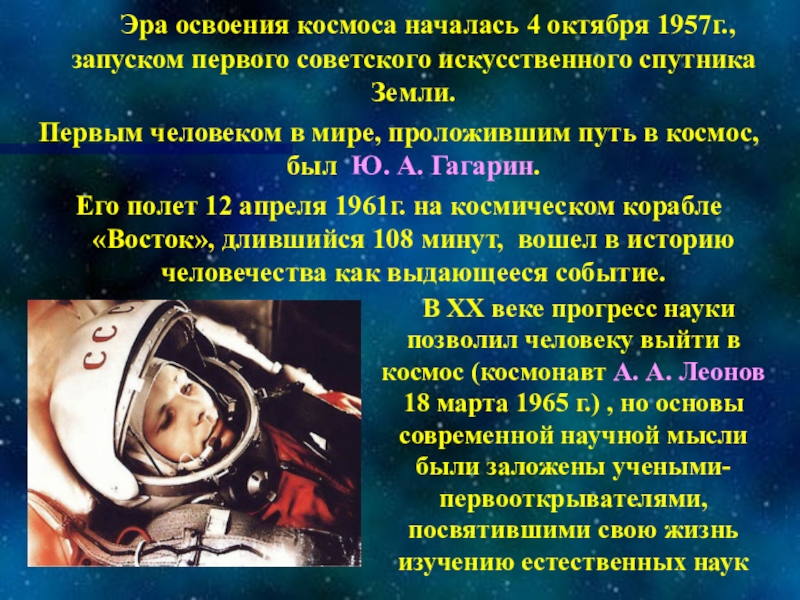 В ХХ веке прогресс науки позволил человеку выйти в космос (космонавт А. А. Леонов 18 марта 1965 г.) , но основы современной научной мысли были заложены учеными-первооткрывателями, посвятившими свою жизнь изучению естественных наук