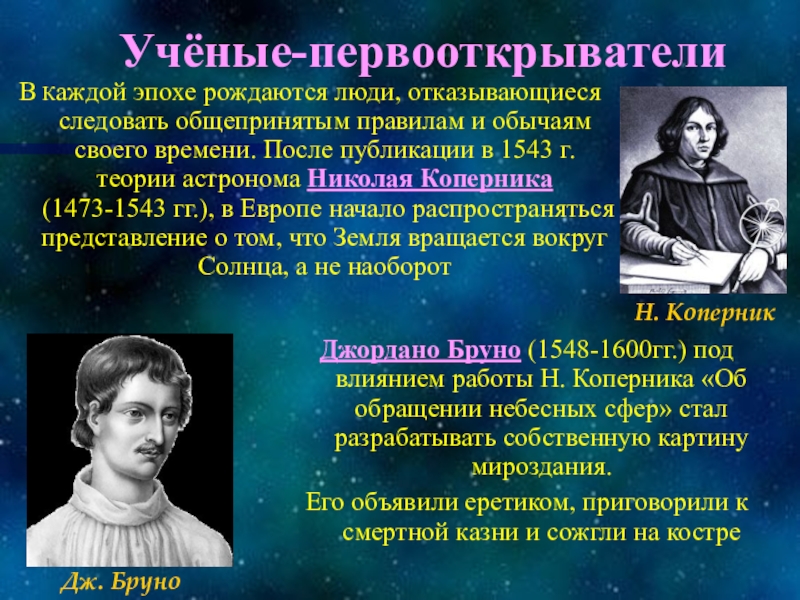 Джордано Бруно (1548-1600гг.) под влиянием работы Н. Коперника «Об обращении небесных сфер» стал разрабатывать собственную картину мироздания.