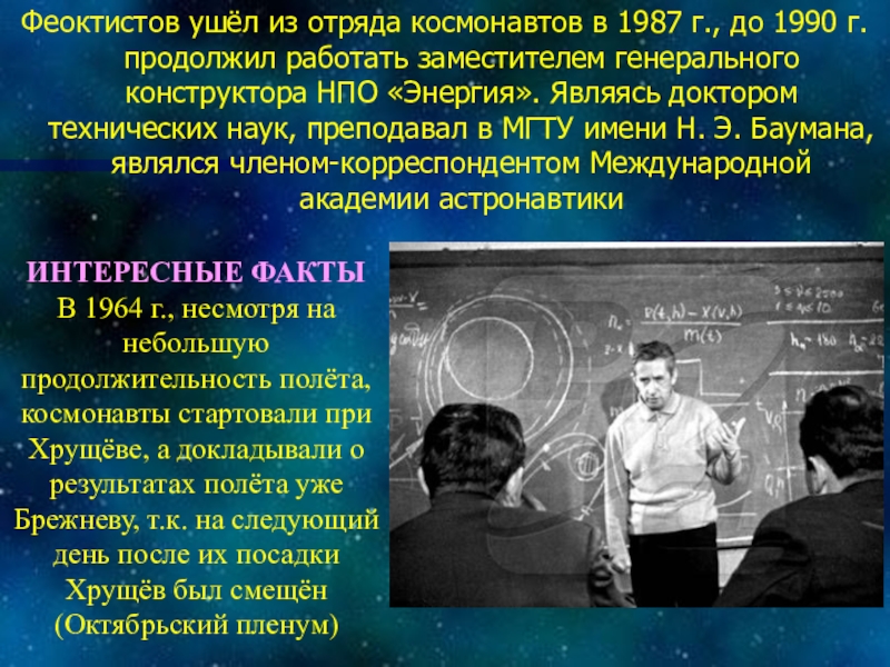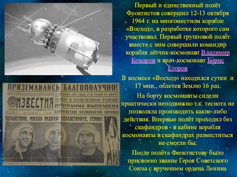 В 1964 г., несмотря на небольшую продолжительность полёта, космонавты стартовали при Хрущёве, а докладывали о результатах полёта уже Брежневу, т.к. на следующий день после их посадки Хрущёв был смещён (Октябрьский пленум)