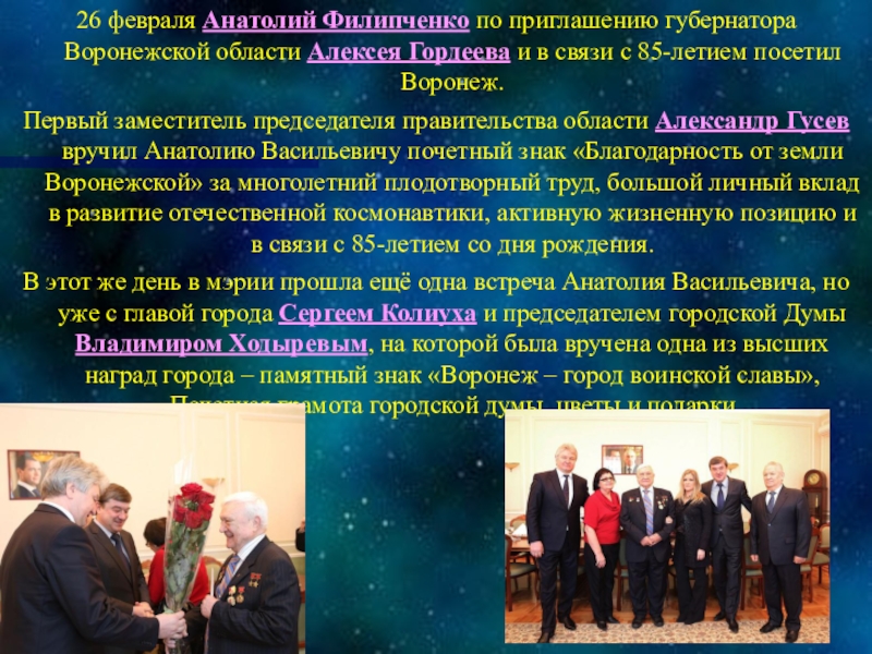 - Почётный гражданин городов: Калуга, Караганда, Липец, Острогожск, Чита, Аркалык (Казахстан), Сумы (Украина), Хьюстон (США), пгт Давыдовка, Михайлов