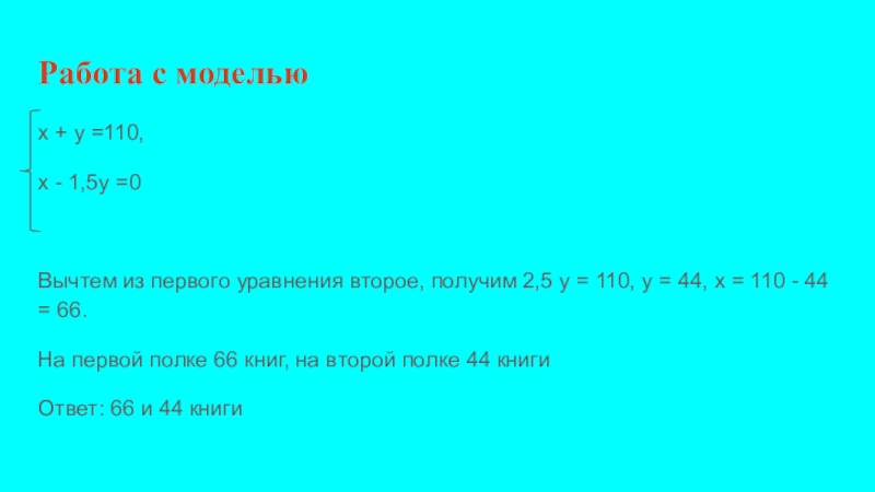 Работа с модельюx + y =110,x - 1,5y =0Вычтем из первого уравнения второе, получим 2,5 y =