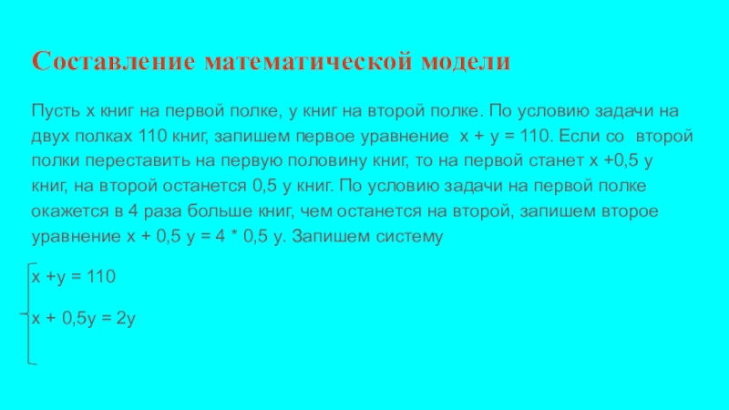 второй полке. По условию задачи на двух полках 110 книг, запишем первое уравнение x + y = 110. Если со второй полки переставить на первую половину книг, то на первой станет x +0,5 y книг, на второй останется 0,5 у книг. По условию задачи на первой полке окажется в 4 раза больше книг, чем останется на второй, запишем второе уравнение x + 0,5 y = 4 * 0,5 y. Запишем систему