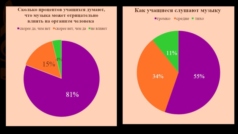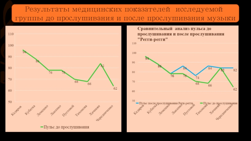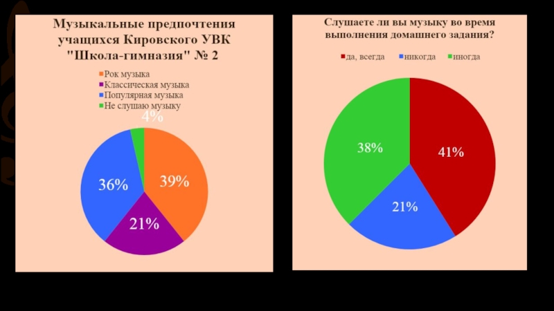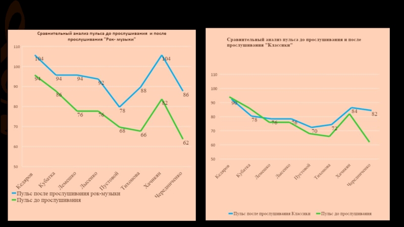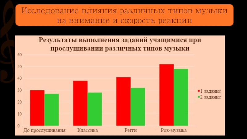 2. Исследование показало, что различные стили оказывают влияние на медицинские показатели и на внимание. В частности, «тяжелая музыка» увеличивает давление и пульс, а так же снижает внимание и скорость реакции.