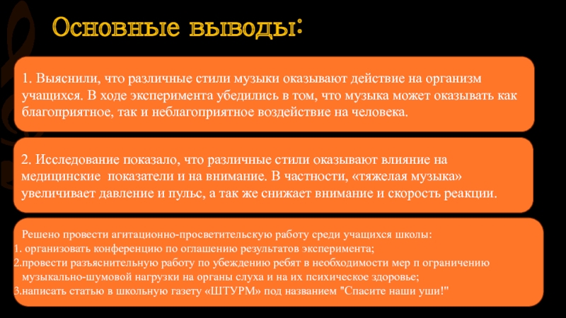 провести разъяснительную работу по убеждению ребят в необходимости мер п ограничению музыкально-шумовой нагрузки на органы слуха и на их психическое здоровье;