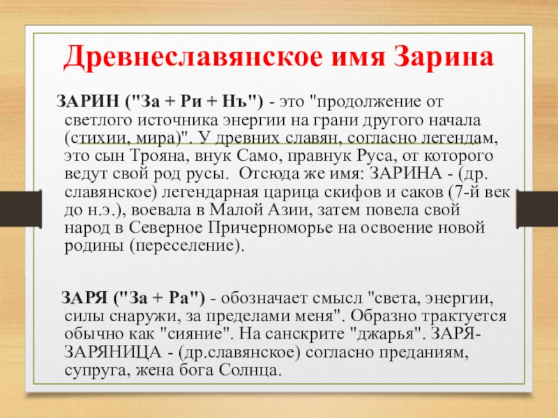 "продолжение от светлого источника энергии на грани другого начала (стихии, мира)". У древних славян, согласно легендам, это сын Трояна, внук Само, правнук Руса, от которого ведут свой род русы. Отсюда же имя: ЗАРИНА - (др.славянское) легендарная царица скифов и саков (7-й век до н.э.), воевала в Малой Азии, затем повела свой народ в Северное Причерноморье на освоение новой родины (переселение).