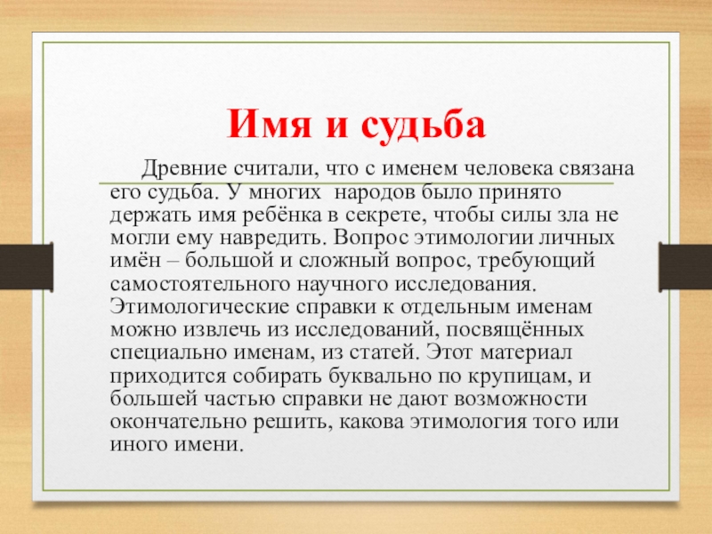 именем человека связана его судьба. У многих народов было принято держать имя ребёнка в секрете, чтобы силы зла не могли ему навредить. Вопрос этимологии личных имён – большой и сложный вопрос, требующий самостоятельного научного исследования. Этимологические справки к отдельным именам можно извлечь из исследований, посвящённых специально именам, из статей. Этот материал приходится собирать буквально по крупицам, и большей частью справки не дают возможности окончательно решить, какова этимология того или иного имени.