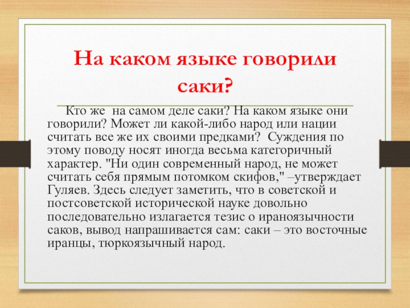 на самом деле саки? На каком языке они говорили? Может ли какой-либо народ или нации считать все же их своими предками? Суждения по этому поводу носят иногда весьма категоричный характер. "Ни один современный народ, не может считать себя прямым потомком скифов," –утверждает Гуляев. Здесь следует заметить, что в советской и постсоветской исторической науке довольно последовательно излагается тезис о ираноязычности саков, вывод напрашивается сам: саки – это восточные иранцы, тюркоязычный народ.