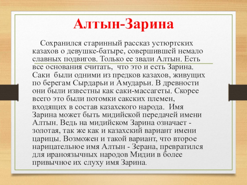 девушке-батыре, совершившей немало славных подвигов. Только ее звали Алтын. Есть все основания считать, что это и есть Зарина. Саки были одними из предков казахов, живущих по берегам Сырдарьи и Амударьи. В древности они были известны как саки-массагеты. Скорее всего это были потомки сакских племен, входящих в состав казахского народа. Имя Зарина может быть мидийской передачей имени Алтын. Ведь на мидийском Зарина означает - золотая, так же как и казахский вариант имени царицы. Возможен и такой вариант, что второе нарицательное имя Алтын - Зерана, превратился для ираноязычных народов Мидии в более привычное их слуху имя Зарина.