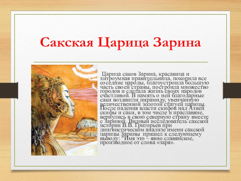 хитроумная правительница, покорила все соседние народы, благоустроила большую часть своей страны, построила множество городов и сделала жизнь своих народов счастливой. В память о ней благодарные саки воздвигли пирамиду, увенчанную величественной золотой статуей царицы. После падения власти скифов над Азией скифы и саки, в том числе и праславяне, вернулись в свою северную страну вместе с Зариной. Видный исследователь сакской истории В.В. Григорьев при лингвистическом анализе имени сакской царицы Зарины пришел к следующему выводу: "Имя это – явно славянское, производное от слова «заря».