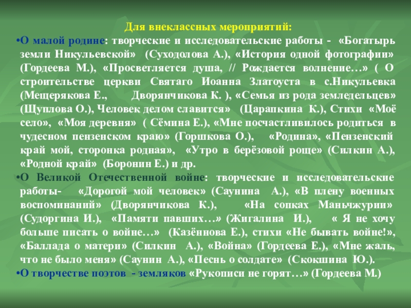 О Великой Отечественной войне: творческие и исследовательские работы- «Дорогой мой человек» (Саунина А.), «В плену военных воспоминаний» (Дворянчикова К.), «На сопках Маньчжурии» (Судоргина И.), «Памяти павших…» (Жигалина И.), « Я не хочу больше писать о войне…» (Казённова Е.), стихи «Не бывать войне!», «Баллада о матери» (Силкин А.), «Война» (Гордеева Е.), «Мне жаль, что не было меня» (Саунин А.), «Песнь о солдате» (Скокшина Ю.).