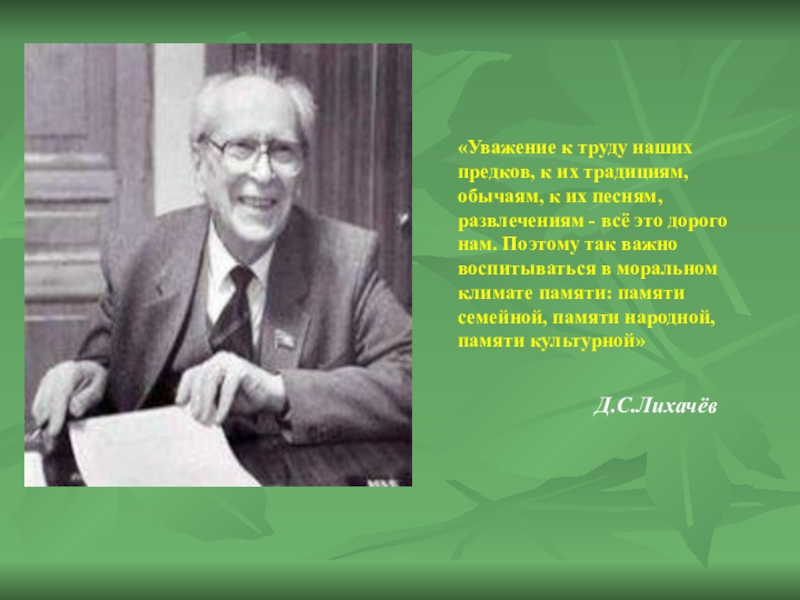 песням, развлечениям - всё это дорого нам. Поэтому так важно воспитываться в моральном климате памяти: памяти семейной, памяти народной, памяти культурной»
