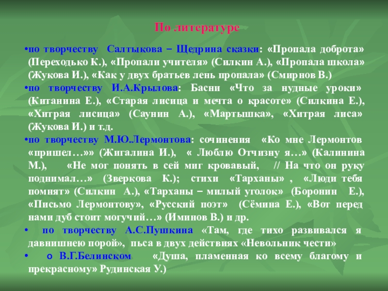 по творчеству М.Ю.Лермонтова: сочинения «Ко мне Лермонтов «пришел…»» (Жигалина И.), « Люблю Отчизну я…» (Калинина М.), «Не мог понять в сей миг кровавый, // На что он руку поднимал…» (Зверкова К.); стихи «Тарханы» , «Люди тебя помнят» (Силкин А.), «Тарханы – милый уголок» (Боронин Е.), «Письмо Лермонтову», «Русский поэт» (Сёмина Е.), «Вот перед нами дуб стоит могучий…» (Иминов В.) и др.